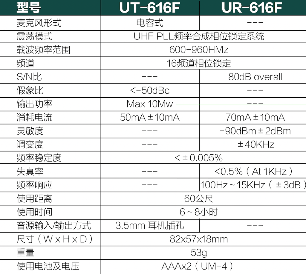 616系列配有LED,可顯示電池電量是否即將耗盡,接收機(jī)和發(fā)射機(jī)都具備音量調(diào)整功能 。使用者可以通過(guò)機(jī)身右側(cè)旋鈕變更頻道 。電池采用 AAA(4號(hào))電池。